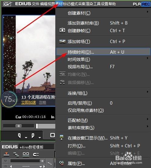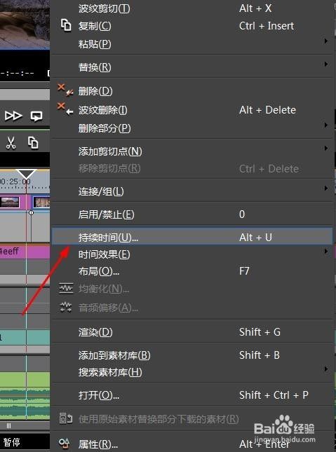 选定要调整素材时间的素材,点击 素材,在弹出的菜单列表中单击持续时间命令。
