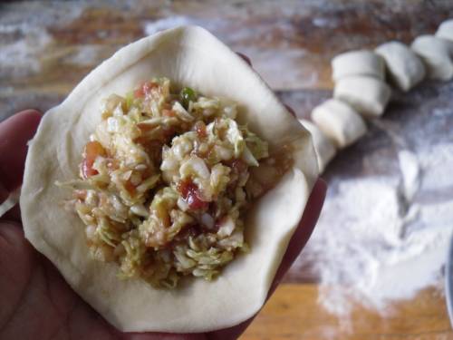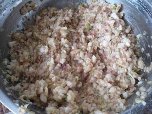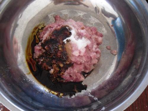 2,猪肉剁成肉馅,调入酱油、熟花生油、盐、香油、味精、葱花搅拌上劲。