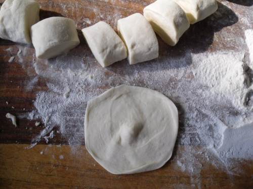 5,面团揉匀切成等份小剂子,擀成薄皮。