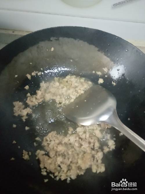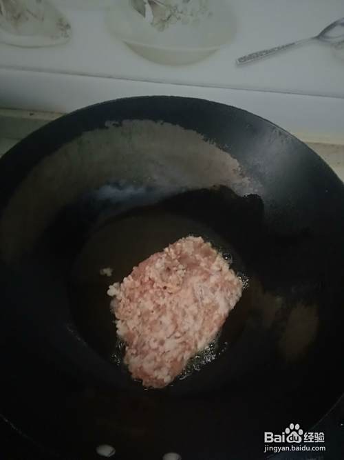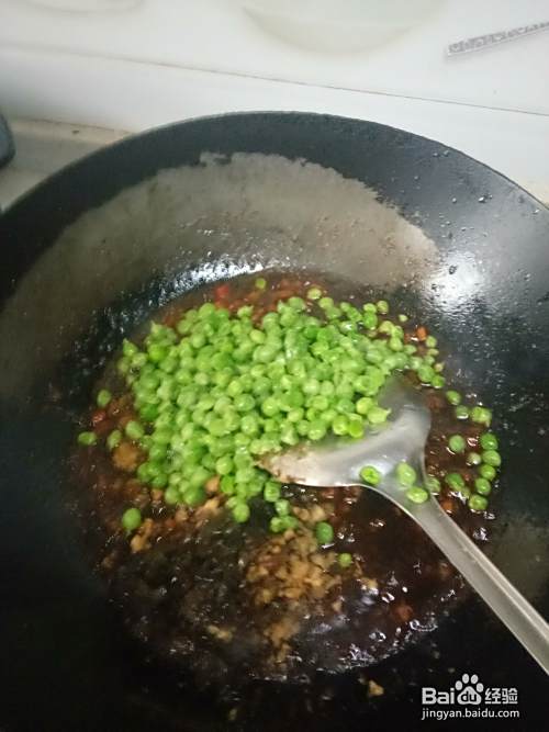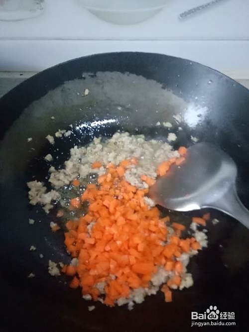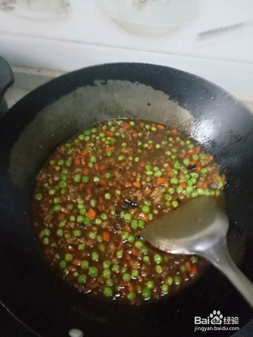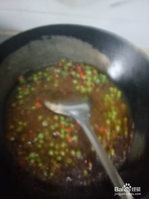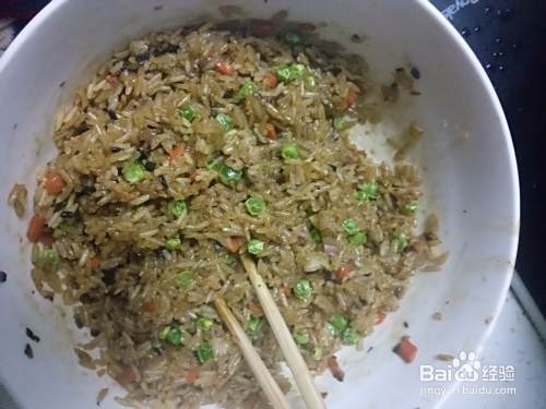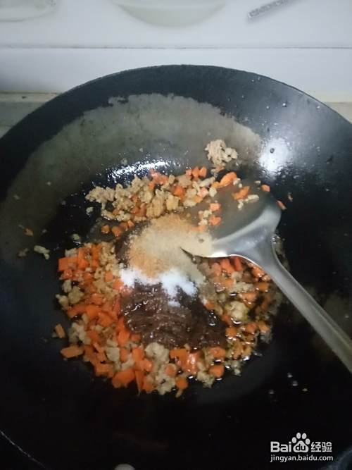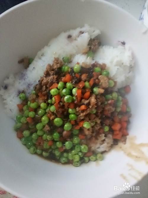炒锅内加入适量的油,油温升起后倒入肉糜,翻炒至变色后加入胡萝卜,翻炒几下后调入盐、南德、生抽、耗油、甜面酱、胡椒粉翻炒均匀。接着加入豌豆,这时加入适量的清水,翻炒均匀煮一会,待汤汁吸收的差不多的时候盛出,放入装糯米的碗中,搅拌均匀。