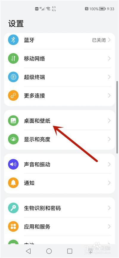 在华为手机设置界面,点击桌面和壁纸选项进入。
