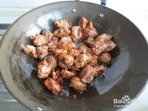 加牛肉翻炒出水分出香味,加老抽翻炒均匀上色