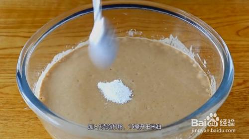 碗中放200克面粉、200克木薯淀粉、4克酵母,搅拌均匀,倒入红糖水,搅拌均匀后发酵入3克泡打粉、15毫升玉米油,搅拌均匀。