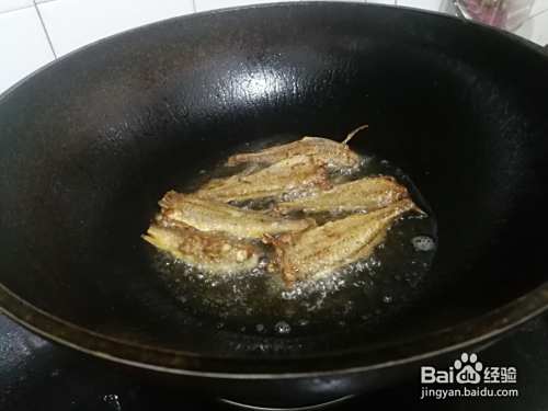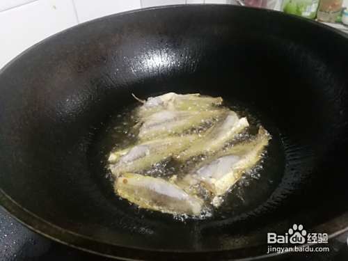 放入小黄花鱼炸制,小黄花鱼炸至金黄色。