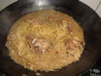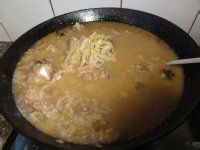再放入酸菜。炖1小时,汤留一点。放入香葱,出锅。