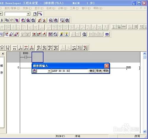 在X0的触点后输入加法指令:ADDP D0 D1 D2。其运算结果放入D0寄存器。