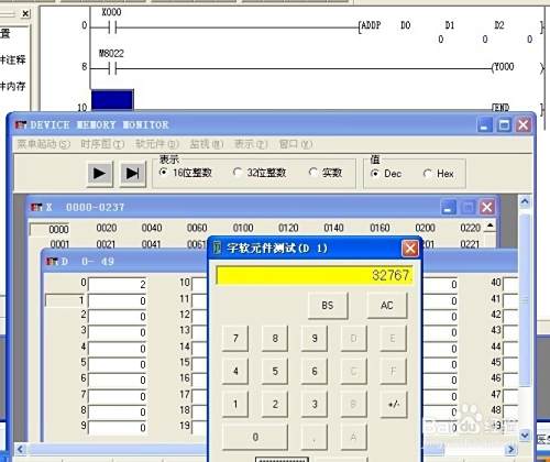 点击监视窗口的X0执行加法运算,可以看到出现进位时M8022接通,同时Y0输出。