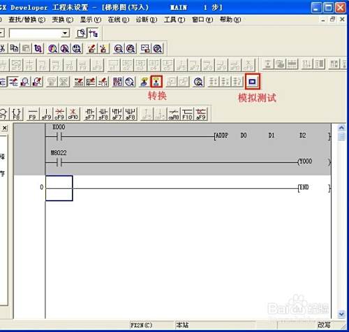 程序编写之后点击转换按钮进行编译,然后按模拟测试按钮将程序写入模拟PLC。
