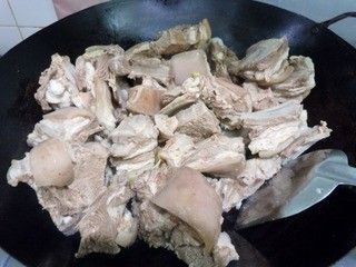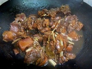 倒入料酒和老抽,继续翻炒,然后加入温水,水量同羊肉持平为准,放入香叶,桂皮,还有自己家做的油辣椒,大火煮开。