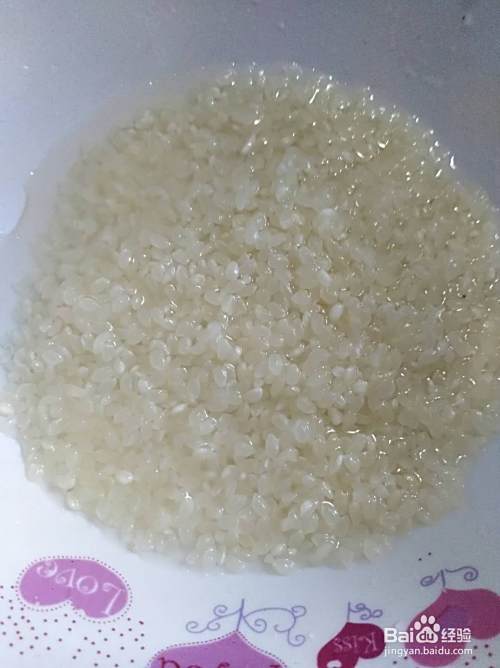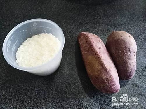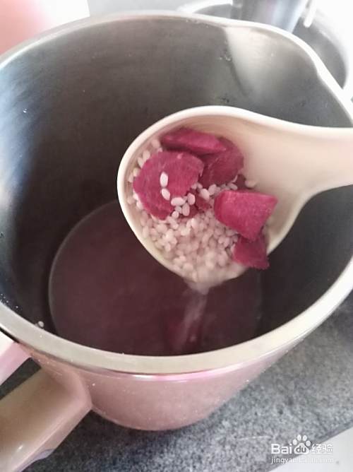 把泡好的紫薯和大米,倒入榨汁机里,加入适量清水;开关按米糊;