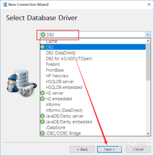 选择Database 驱动,这里我数据库是DB2的,所以选择DB2驱动,如下图所示。