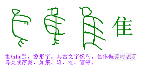 首先认识一下,隹(拼音:zhuī、cuī、wéi)是汉语通用规范三级字。此字初文始见于商代甲骨文及商代金文,其古字形像鸟。