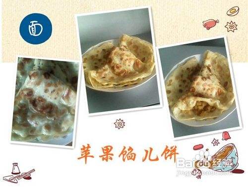 平底锅中刷少许油,8分热后倒入面糊,铲子摊薄,表面凝固发阴后刷油,翻面、倒入苹果馅儿,占饼饼面积四分之一。
