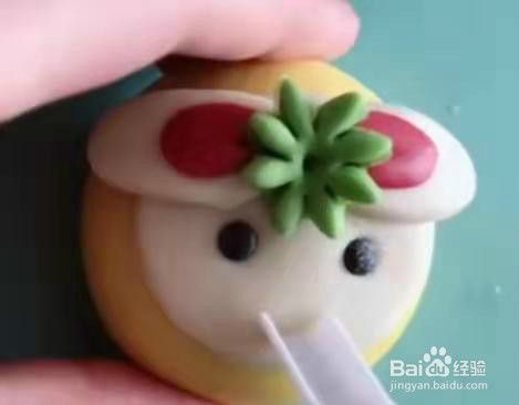 用绿色面团做朵小花戴在头上。见下图