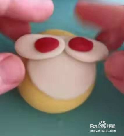用白色面团和红色面团做小羊的耳朵。见下图