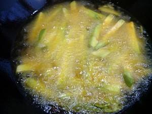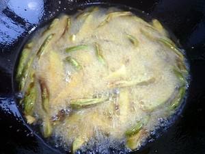锅内倒适量油,待油温热时倒入切条,炸至金黄捞出