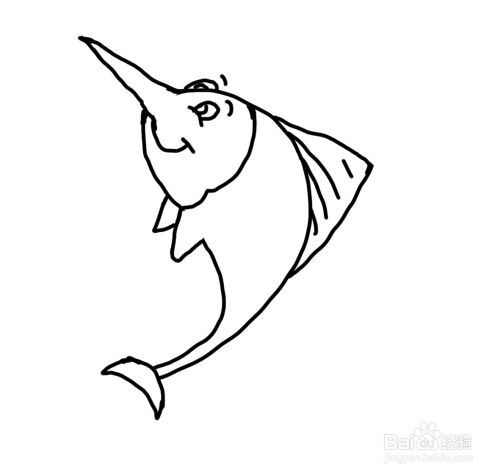 第二步,画完剑鱼的身体部分,接着开始画出剑鱼的眼睛的位置,画出剑鱼的嘴巴的形状。