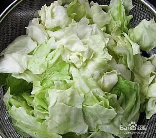 圆白菜剥去最外面一层,切开后去硬心,然后切成片,洗净备用。