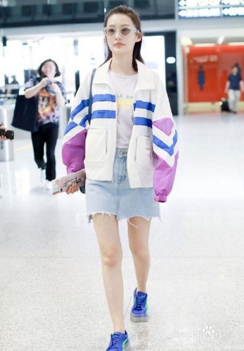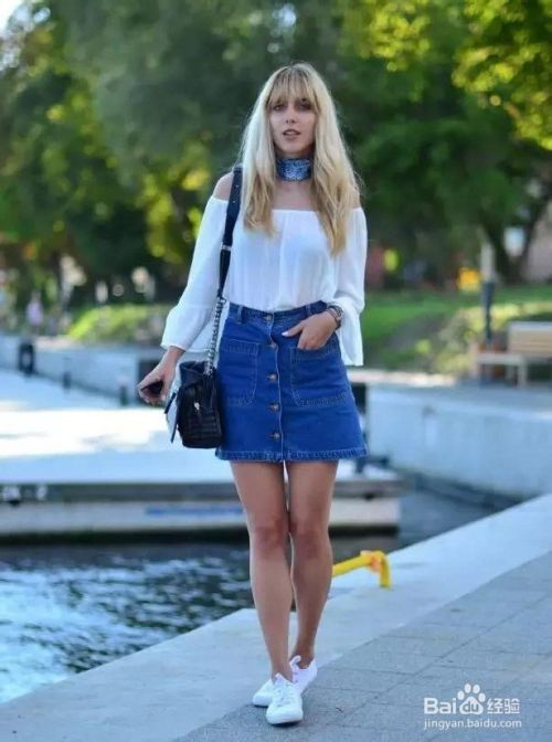 牛仔短裙的款式有很多,系扣的牛仔短裙是很流行的一款,上衣搭配一件白色一字肩雪纺衫,是很简约、清新又带着几分小性感的搭配。