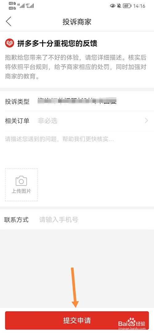 填写相关信息,描写原因,填写订单和上传证据,点击下方的提交申请。