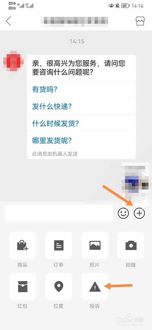 点击聊天框最右侧的+号键,选择最后一个投诉选项。
