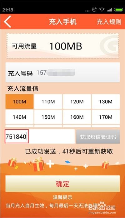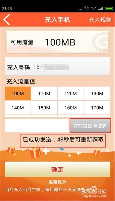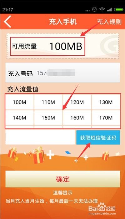 在充入手机界面,我们看到有100MB的可用流量,选择充入流量值,点击获取短信验证码,等待接收验证码