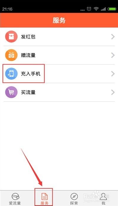 登陆后,点击底部的服务,然后会看到有个充入手机,点击进去