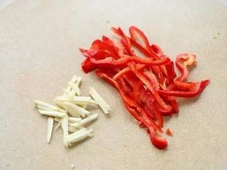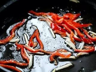 另起一锅,倒入食用油,加热,放入红椒和大蒜,炒香。