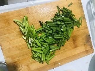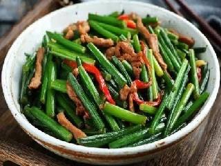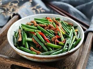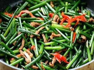 锅内倒入食用油,加热,放入里脊肉,炒熟,另起一锅,倒入食用油,加热,放入红椒和大蒜,炒香,加入韭菜黄和食盐,炒熟,加入肉丝,炒匀。