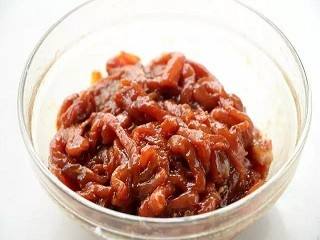 里脊肉清洗干净,切丝,加入生抽、老抽、食盐、淀粉、料酒和食用油,搅拌均匀,腌制15分钟。