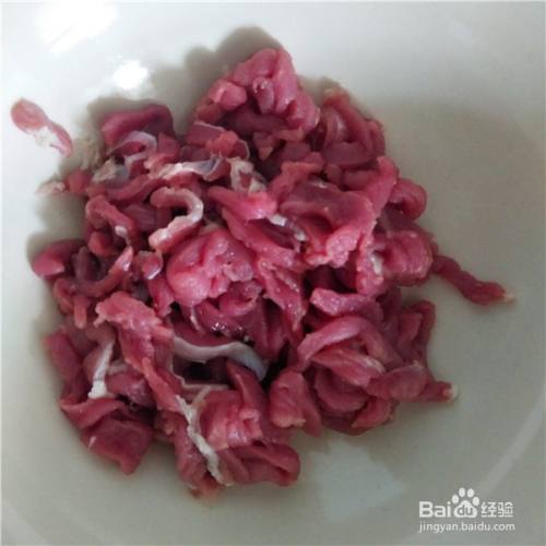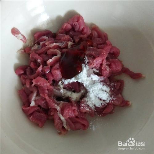 2、瘦肉清洗干净,切成细丝,加入料酒、盐、蚝油、生粉,抓匀腌10分钟。