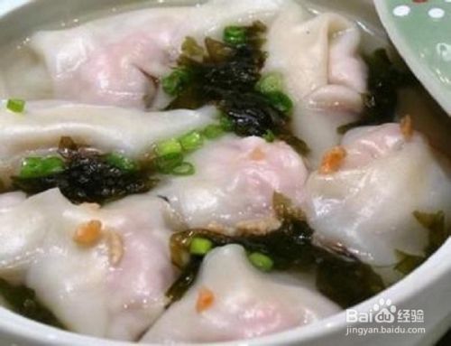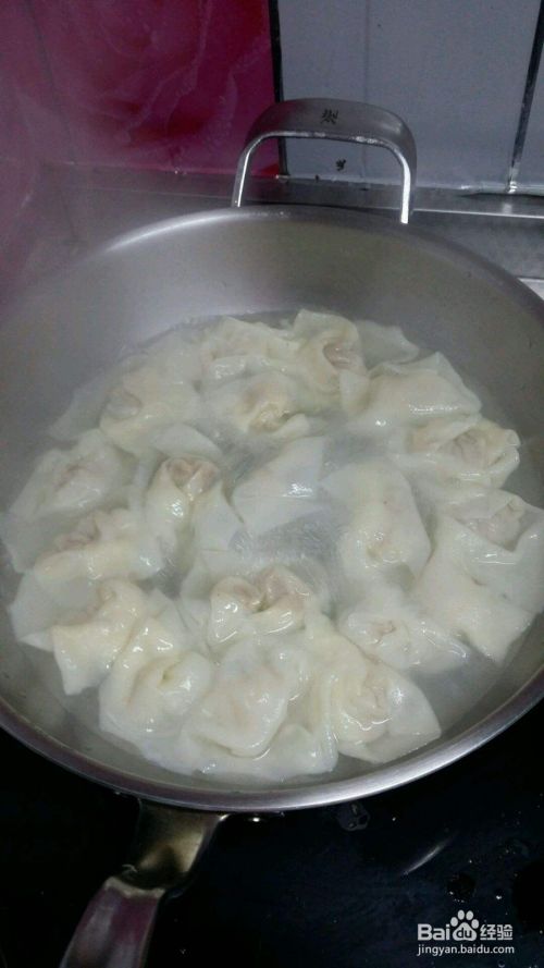 4.将鸡汤倒入锅内烧开,加入精盐、料酒、胡椒粉、味精,调好口味。同时,另锅烧开水煮馄饨,用手勺顺着锅边推搅,待馄饨浮起时,分别捞入5个碗内,浇上鸡汤,即可食用。