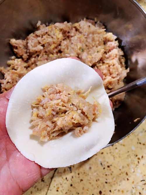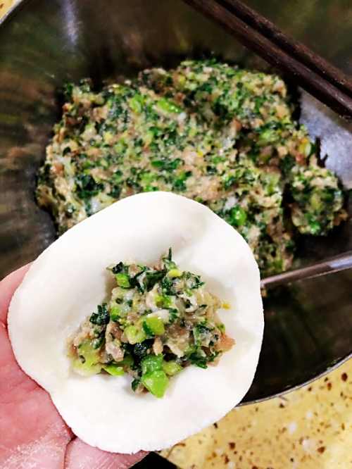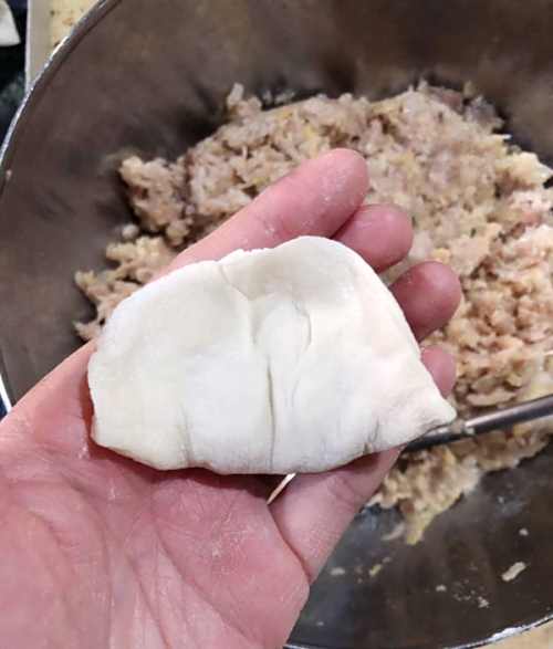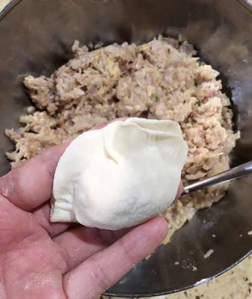 16填入油渣白菜馅 对折 用双手虎口压紧
