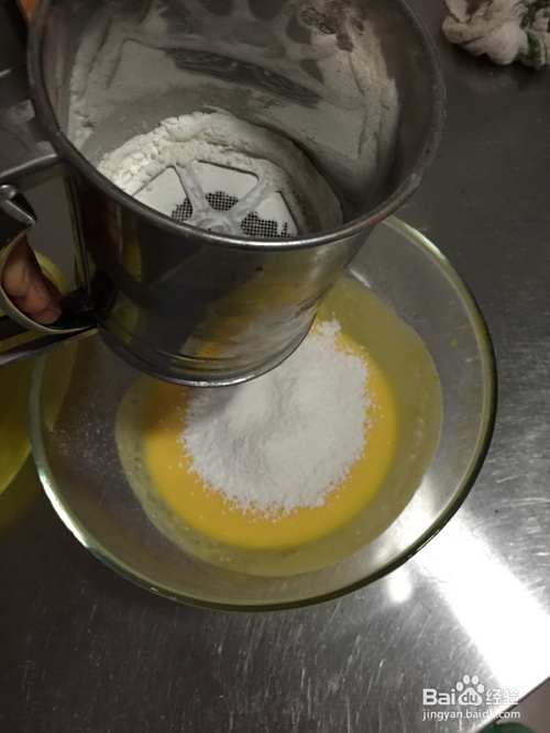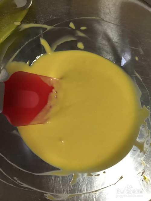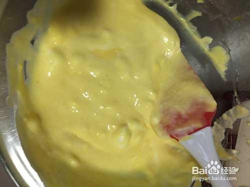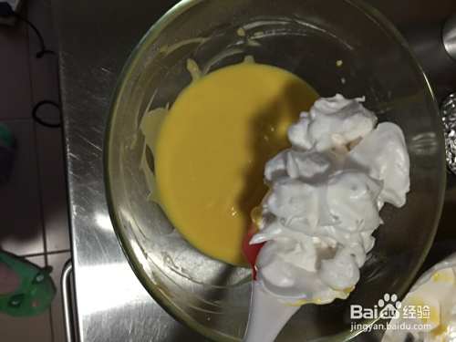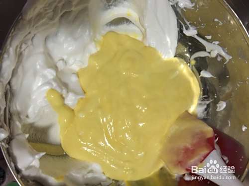 拌匀后将蛋黄糊倒入蛋白霜中,仍然上下翻拌,不要搅拌划圈