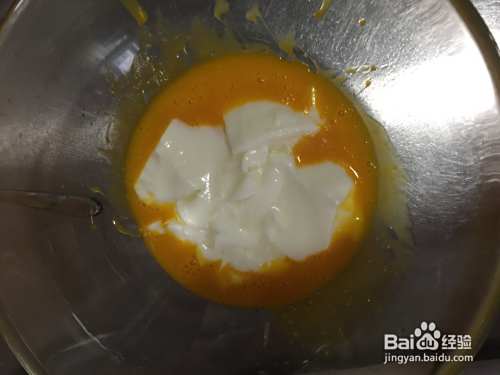 蛋黄打匀,加入老酸奶,必须是稠的酸奶