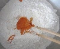 将胡萝卜泥一点一点加入面粉中(不够可以加水),搅成雪花片,揉成面团。