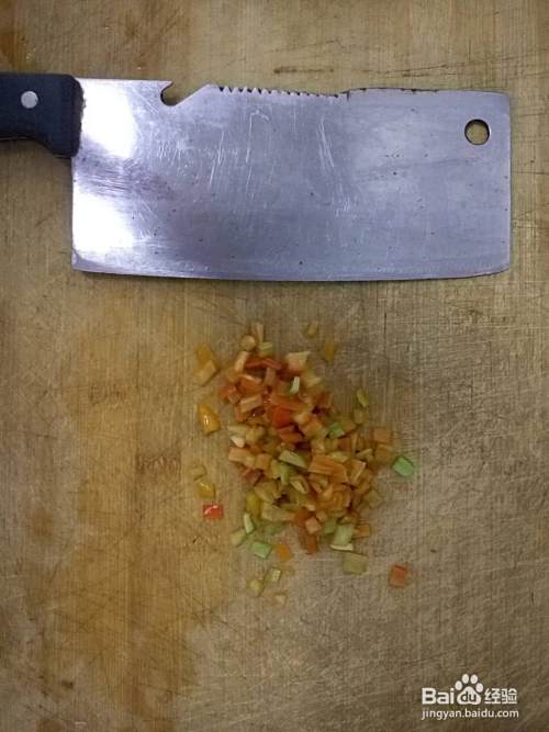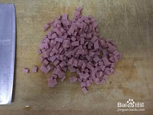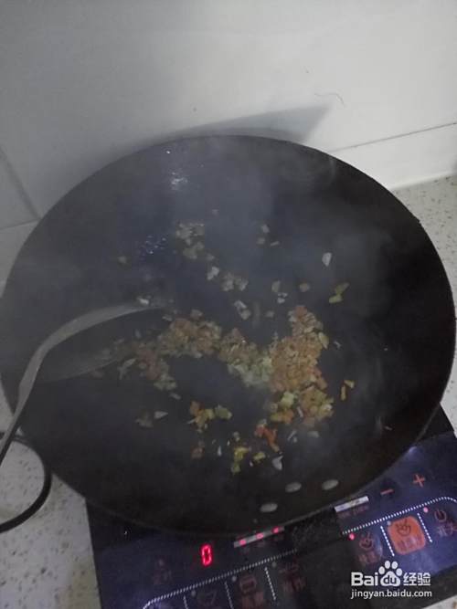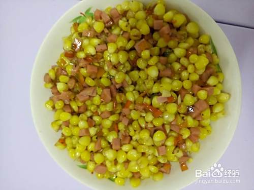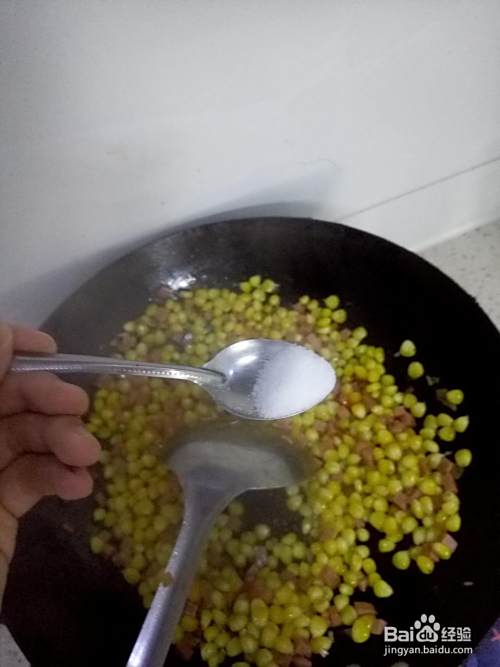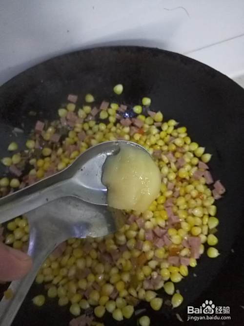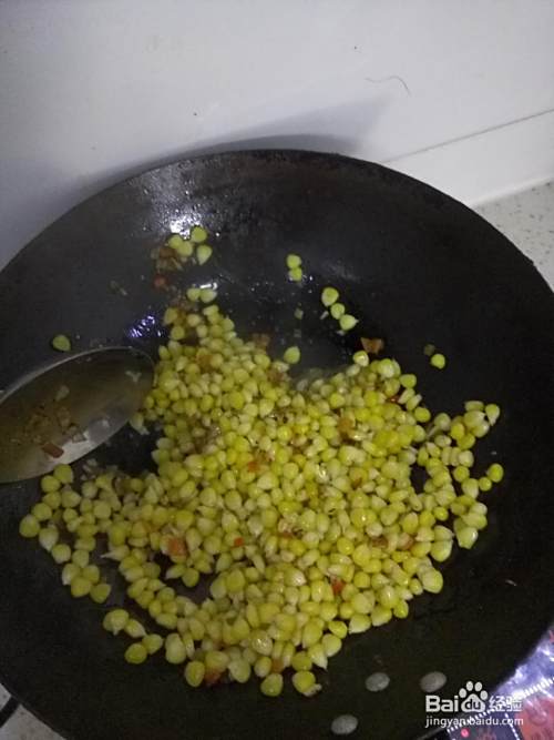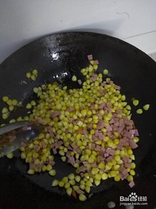 待辣椒丁和蒜末翻炒出香味的时候,加入玉米粒翻炒,翻炒1分钟后加入火腿粒继续翻炒