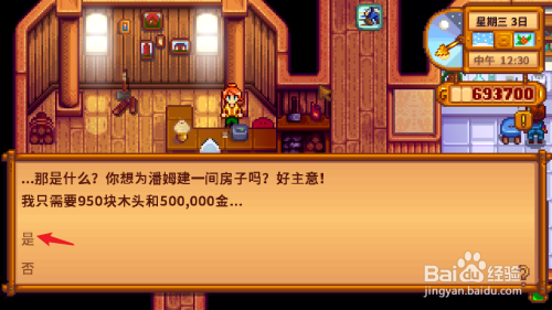 5、点击【是】,消耗木头和金币给潘姆造房子。