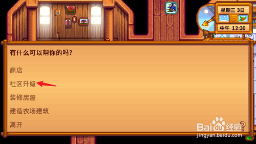 4、和木匠罗宾npc对话,点击【社区升级】。