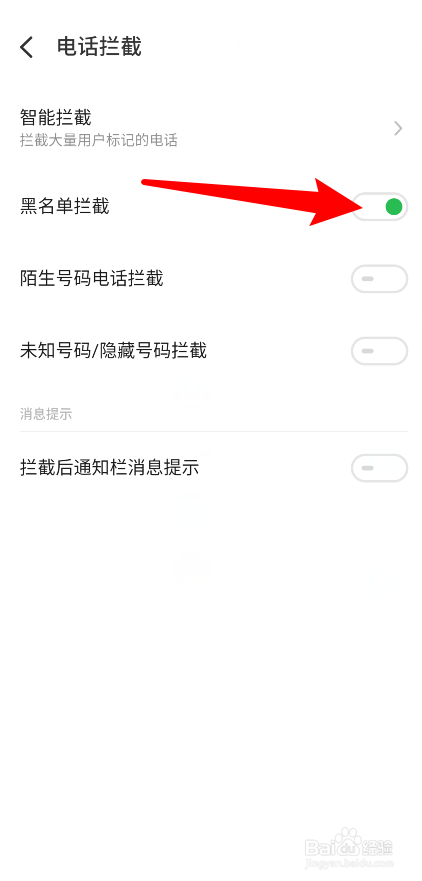 5、最后把黑名单拦截后面的开关打开就可以了。