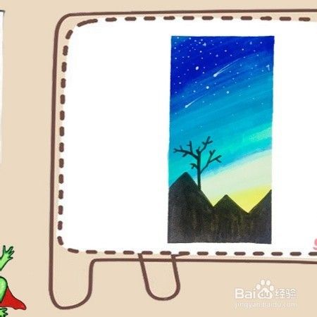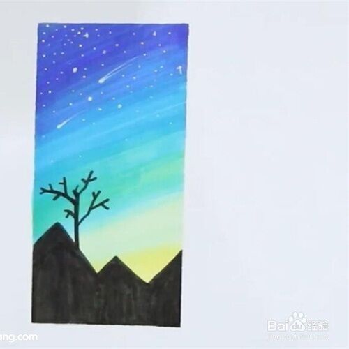 底部用黑笔画出山峰轮廓并上色后,在上面画出一颗没有叶子的树干。
