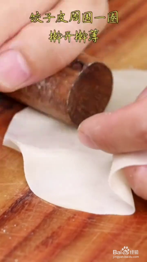 最后加入胡椒粉和盐,翻炒后关火,然后用擀面杖将饺子皮的边缘擀薄