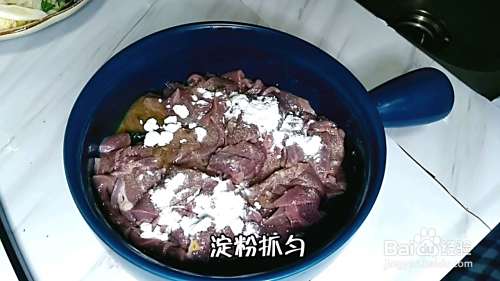 猪肝切片,然后用清水多冲洗几遍,直至水清无血色。加白胡椒粉、半个蛋清和一勺淀粉抓匀,最后再加少许食用油锁住水分