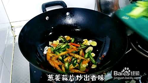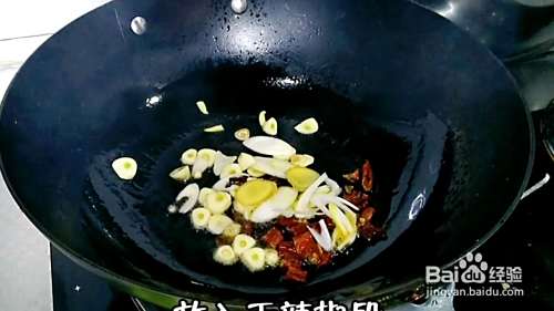 另起锅倒油,放红辣椒段和葱姜蒜片炒香