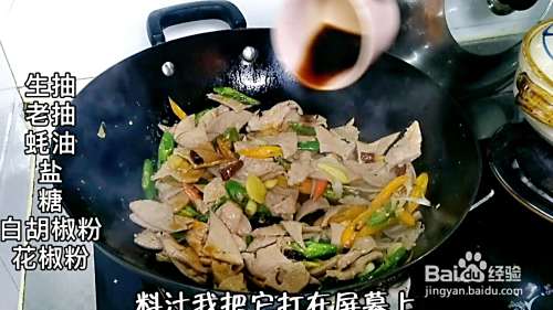 放猪肝和提前调好的料汁(2勺生抽,1勺蚝油,适量老抽,少许盐和糖,1小勺白胡椒粉和1小勺花椒粉)
