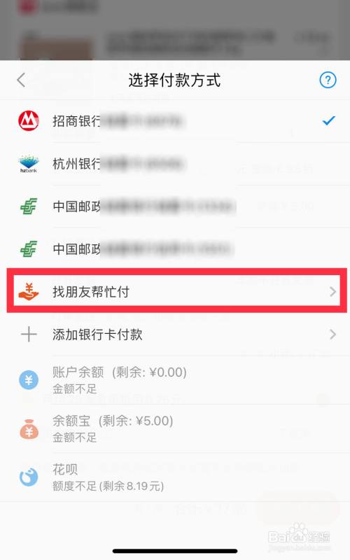 进入选择付款方式页面里,点击“找朋友帮忙付”选项。