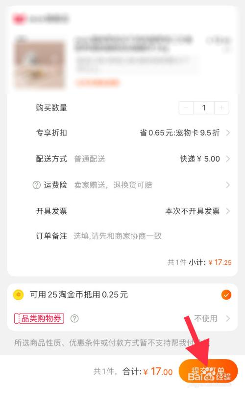 在手机淘宝确认订单页面里,点击右下角的“提交订单”。