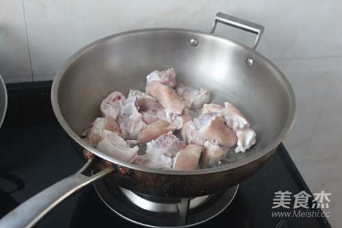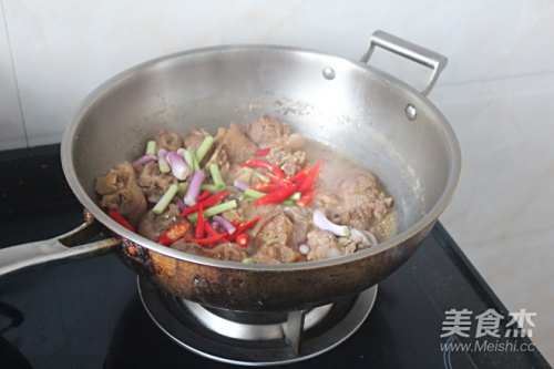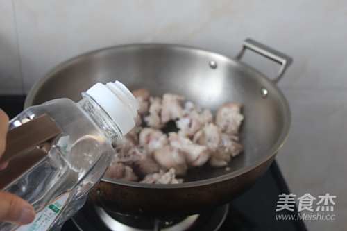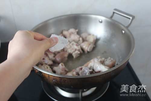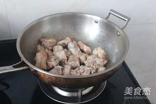 2炒锅烧热不放油,放猪蹄小中火慢慢把水炒干,炒至锅里没有水要准备粘锅的时候为止。