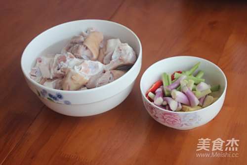 1猪蹄提前半天准备好,用温水泡去血水,中途半小时换一次水,做出来的猪蹄更好吃入味。葱姜蒜小米辣洗净切好备用。