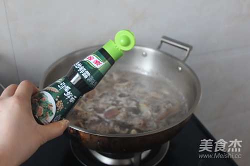 3把猪蹄拨到周围,改小火,然后倒少量的油在中间。